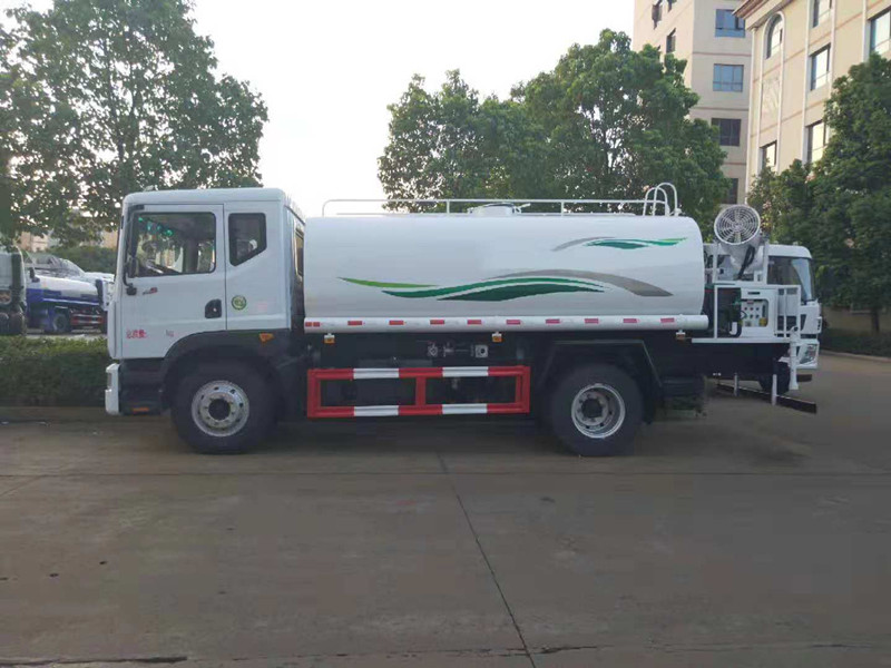灑水車隨底盤選裝駕駛室;選裝側噴及農藥炮;品名:水;密度:1000千克/立方米;有效容積:15.6立方米;罐體外形尺寸(長×長軸×短軸)(mm):6600×2300×1500;ABS吸程≧7米,灑水寬度≧14-16米,射程≧25-30米,引水時間<5min,流量60m3/h。前沖(噴)、后灑、帶側噴(花灑)、帶后工作平臺、平臺上安裝綠化灑水高炮(炮噴射形狀可調節:直沖、大雨、中雨、毛毛雨、霧狀、可連續調節,360°旋轉),配消防接口,自流閥,濾網,帶自吸自排功能。配備大功率專用灑水泵,泵可自吸自排,安裝過濾網,帶消防接口,可通過消防栓進水,帶自流閥,隨車選裝20米綠化卷盤,可噴灑農藥,罐體金屬漆。罐體有橢圓和方圓罐兩種,可根據用戶的要求定做。