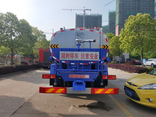 上裝配置:罐體容積為8-10立方灑水車,罐體鋼板為4mm碳鋼Q235材質(zhì),罐內(nèi)隔板具有防波作用,以減輕汽車行駛時(shí)罐體液體沖擊,罐體及整車外形尺寸按照公告。帶大功率專用灑水泵,泵可自吸自排,整車前沖、后灑、側(cè)噴、帶65消防接口,后平臺(tái)帶綠化灑水炮,灑水炮可全方位旋轉(zhuǎn),可連續(xù)調(diào)成直沖狀、大雨、小雨、毛毛雨;前封頭帶水位計(jì),后平臺(tái)主管路帶1寸澆花接口,后爬梯。平臺(tái)后部帶小安全告知牌:“隨時(shí)停車,注意安全”,帶兩根水管及陰陽(yáng)端。罐體顏色:上白/下藍(lán),銀灰/銀藍(lán),罐體兩側(cè)噴“灑水車、綠化噴灑車”字樣,貼反光標(biāo)示。灑水車可加裝前沖后灑氣動(dòng)閥駕駛室控制、可加裝霧炮機(jī)組發(fā)電機(jī)組噴霧降塵裝置、車頭可加裝推雪雪鏟、雪滾裝置街道、公路除雪等。