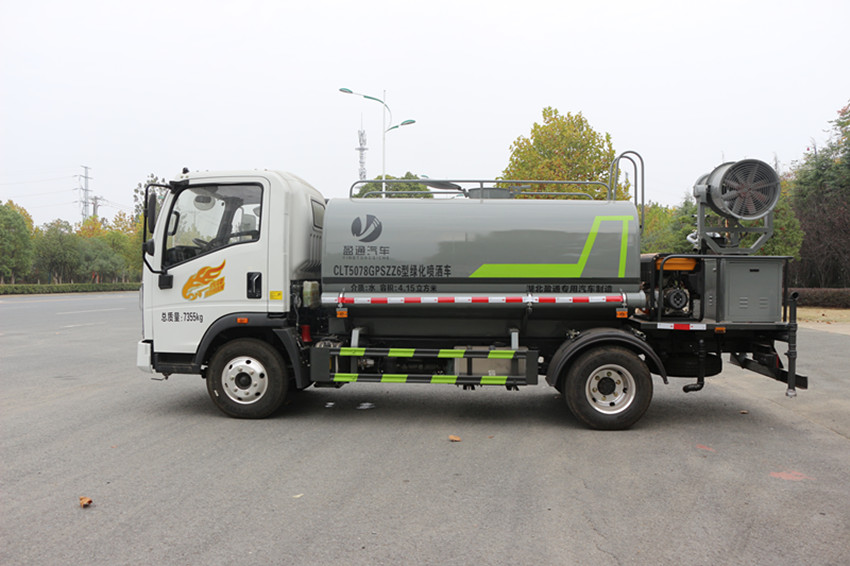 5立方灑水車專用配置:罐體標準容積5.0立方,采用4mm**碳鋼板,罐內制作減震波浪隔板,以減輕汽車行駛時罐體液體沖擊,配置灑水車水泵,可泵進泵出,安裝前沖、后灑、側噴、灑水平臺、灑水高炮(可360度旋轉,可調節直流、大雨、小雨、毛毛雨、霧狀),前封頭帶水位計,后平臺主管路帶1寸澆花接口,后爬梯,平臺后部帶小安全告知牌:“隨時停車,注意安全”,配置兩根三米的吸水管,電子音樂喇叭,及消防接口。罐體顏色:銀灰/銀藍,或上白/下藍,罐體兩側噴“灑水車、綠化灑水車”字樣,貼反光標示。灑水寬度≥12米,高炮射程≥25米,垂直吸程≥6米。
