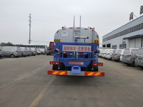 罐體用4MM碳鋼板制作,罐內隔板具有防波作用,以減低汽車行駛時罐體液體的沖擊。整車帶一個專用灑水泵(垂直吸程6米),灑水寬度14米,射程28米。多功能灑水車配備2個前沖(噴)(能將路面泥巴、塵土、垃圾沖干凈);2個后灑(能均勻地將水灑在路面,一次灑水寬度14米)、2個側噴(花灑)(能均勻地將路旁綠化帶澆灌)、帶1個后工作平臺,