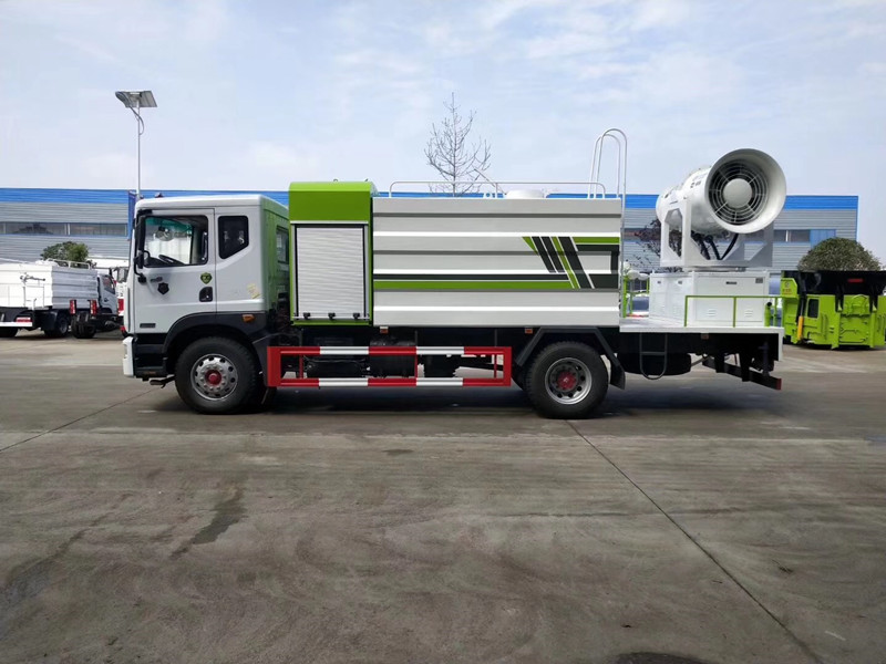 國六50米東風霧炮車價格12噸灑水抑塵車最新款式上裝配置:罐體采用5mm厚碳鋼板制作,罐體容積12噸,配備大功率專用灑水泵。前沖(噴)后灑,帶側噴,后置工作平臺,平臺上安裝綠化灑水高壓炮(炮噴射形狀可調成直沖狀、大雨、中雨、毛毛雨、炮可360度旋轉,射程≧25米)。帶自流閥,消防接口。帶自吸泵,可抽水或從消防栓上連接注水。后工作平臺可加裝最小50米霧炮或60米、80米霧炮。