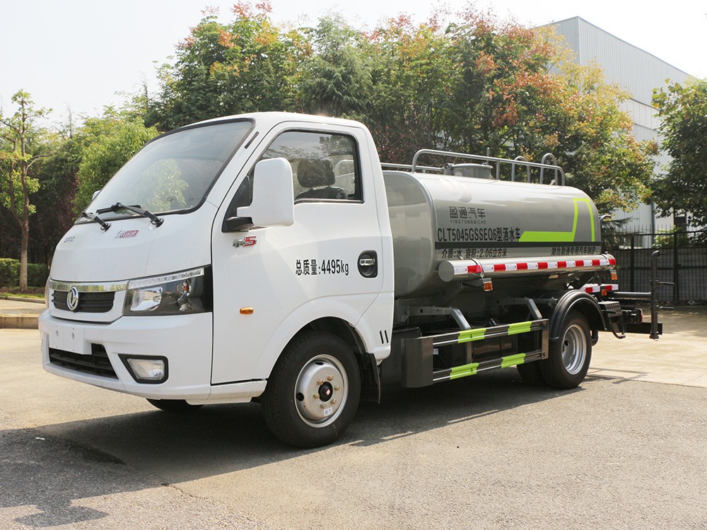 東風途逸 小型灑水車產品主要技術參數 序號 名稱 型號、規格 1 整車型號 CLT5040GSSEQ6 型灑水車 2 發動機型號 Q23-95E60 3 發動機馬力/功率 全柴 95 馬力/70KW 4 發動機排量 2300ML 5 變速箱 萬里揚 5 檔 6 輪胎規格 185 真空胎 7 軸距 2800 8 總質量 4495KG 9 整備質量 2390KG 10 額定載質量 1975KG 11 整車尺寸(長×寬×高) 5.75*1.85*2.1 12 罐體容積 2.6 方 13 燃料種類柴油 14 排放標準 國六 15 水泵型號 40/50 16 罐體材質 Q235 碳鋼四. 產品功能展示 后對沖 后灑 側噴 高炮