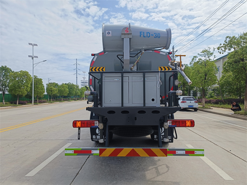 產品簡述:縱昂牌 CLT5188GPSEQ6A 型綠化噴灑車標配前噴(鴨嘴)、后對沖、 后灑、側噴、后置式工作平臺,平臺上配置綠化水炮(可 360°旋轉,既可以調 成柱狀,也可以調成霧狀),配備優質大功率專用灑水泵(可自吸自排,可從河 里或池塘抽水到罐體),取力器,雜物過濾網,消防接口,自流球閥系統、取力 器、球閥、濾網均為國家標準產品,主管道加粗,法蘭墊、法蘭盤加厚,大通徑 球閥。整體具備性能優良安全可靠、效率高、流量大、維修方便等特點