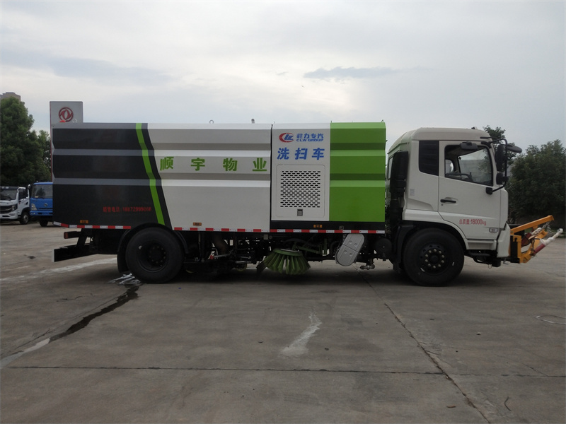 洗掃車采用中置兩刷盤,中置寬吸盤,配上具有防撞避障功能的V型高壓沖水架,組成一條大于3.5米的沖洗清掃帶。采用康明斯EQ6BT5.9-118型副發動機現階段亦有采用電動作為動力的驅動裝置橫置在車架中部,具有氣動離合裝置控制的抽吸風機布置在動力倉的左側。采用不銹鋼材料加工而成的水箱與垃圾箱均為采用方形瓦棱結構。水箱分為兩部位,一部分為前置獨立水箱,裝配在動力倉的前部;另一部分為設置在垃圾箱前部的水箱,可隨垃圾箱與動力倉罩同時升降。具有舉升功能的垃圾箱內裝配有高壓沖洗噴頭,使得卸料更為輕松、干凈徹底。能夠隨垃圾箱體舉升的動力倉罩可使動力系統的維修保養極為便利。采用歐美地區的名優配套部件,使得整車性能更為優良,工作更為可靠。