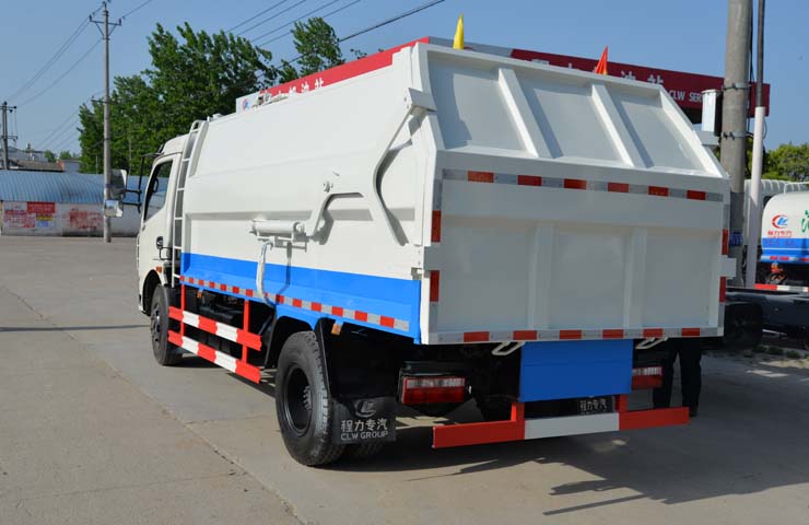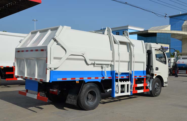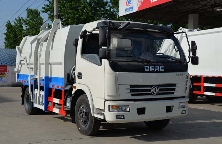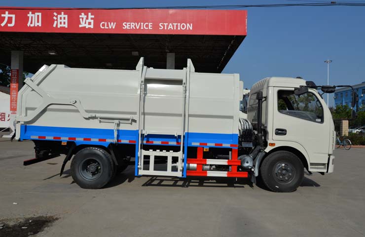 容積6~8立方米,箱體采用Q235碳鋼材質,箱體右側配液壓掛桶提升機,可掛國標120升+240升塑料垃圾桶,駕駛室外部手動操作,鐵通掛架;后門鎖緊為機械鎖緊,手動開啟;相同結構為槍版形式。