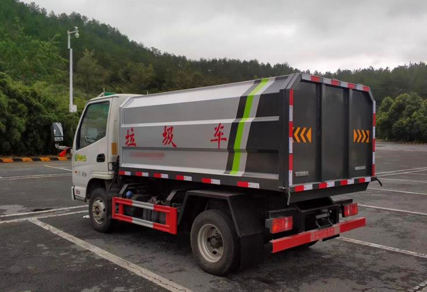 箱體容積3~4立方米,碳鋼邊三底四,國產(chǎn)油泵、多路閥、取力器、油缸,卸料方式為底部雙杠液壓舉升自卸,駕駛室外操作,鐵桶掛架,后門機(jī)械鎖緊,手動開門,可選液壓開門。