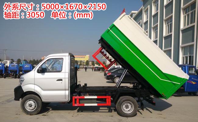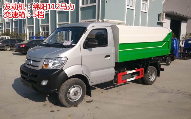 重汽王牌掛桶式垃圾車,1650單排駕駛室,綿陽112馬力汽油發(fā)動機,5檔變速箱,185R14LT輪胎型號,140大梁,3噸后橋、油剎。