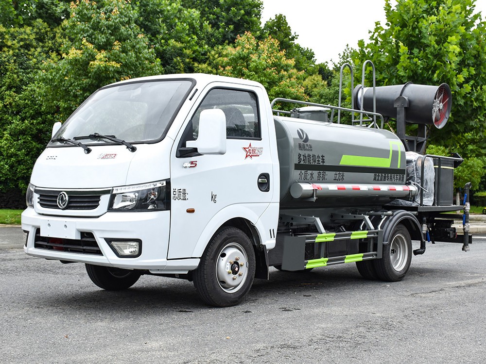 東風途逸 2.5 方抑塵車主要技術參數 序號 名稱 型號、規格 1 整車型號 CLT5040TDYEQ6 型多功能抑塵車 2 發動機型號 Q23-95E60 3 發動機馬力/功率 全柴 95 馬力/70KW 4 發動機排量 2300ML 5 變速箱 萬里揚 5 檔 6 輪胎規格 185 真空胎 7 軸距 2800 8 總質量 4495KG 9 整備質量 2880KG 10 額定載質量 1485KG 11 整車尺寸(長×寬×高) 5.8*1.85*2.6 12 罐體容積 2.5 方 13 燃料種類 柴油 14 排放標準 國六 15 水泵型號 40/50 16 罐體材質 Q235 碳鋼四. 產品功能展示 霧炮 后灑 后對沖 高炮 側噴